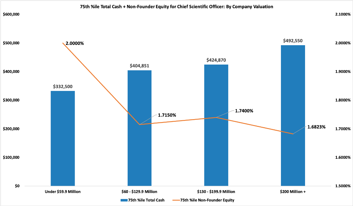 In order to explain which filters truly make a difference in compensation, we break it down by examining data for a chief scientific officer. The two charts below customize the data by total amount of financing vs company valuation.