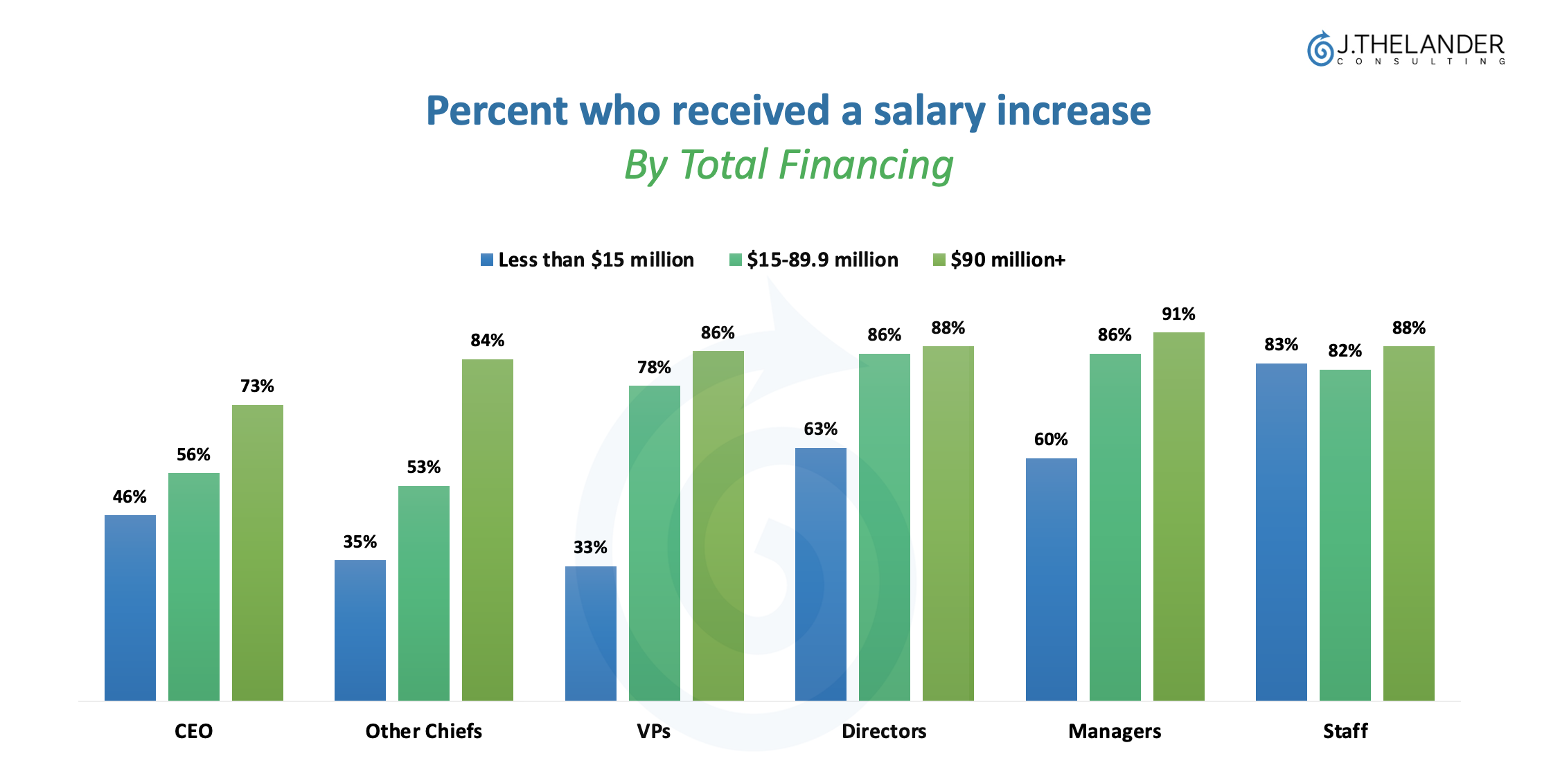 Did it make a difference? YES! The percentage of companies giving raises increases as a company raises more financing, especially among C-Suite and VP-Level roles. Better funded companies have more capital to put towards compensating employees.