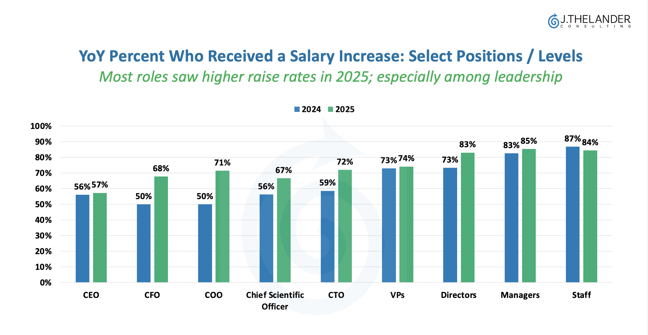 The percentage of those who received a salary increase for 2026 climbed significantly across leadership roles compared to “for 2025,” but not uniformly. Here’s where the action is: