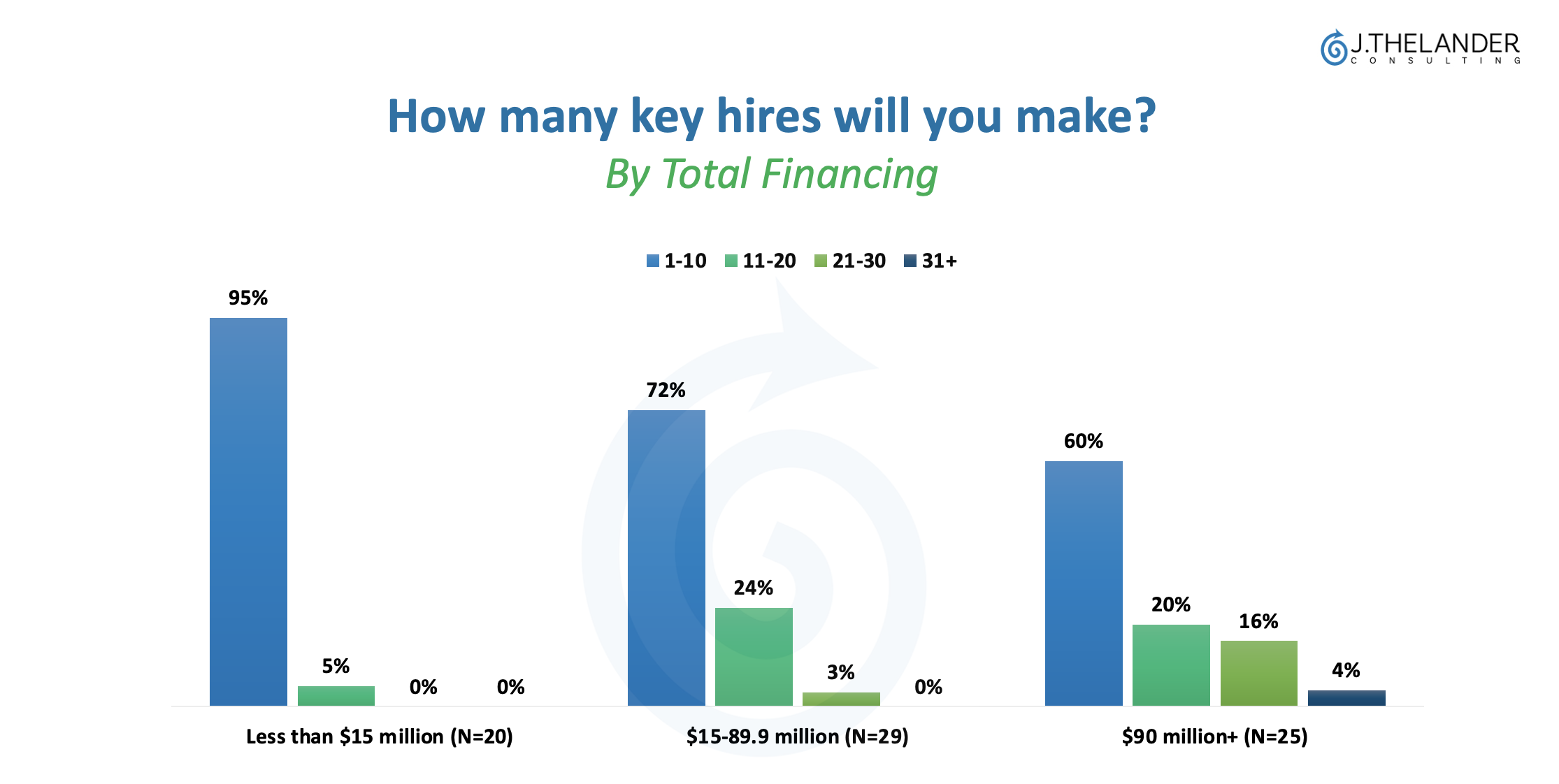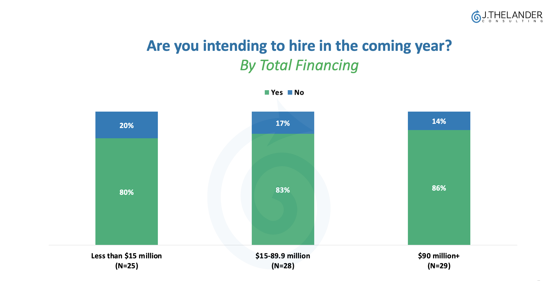 We asked survey participants if they plan to hire in 2026. The answer? The same financing-stage pattern holds. Companies with more capital are planning to hire more key employees. Well funded companies are more likely to give raises and hire more aggressively. Early stage companies are moving a little more slowly with new hires and are more strategic about compensation – ensuring they get the mix of cash and equity right in the beginning to avoid issues later on.