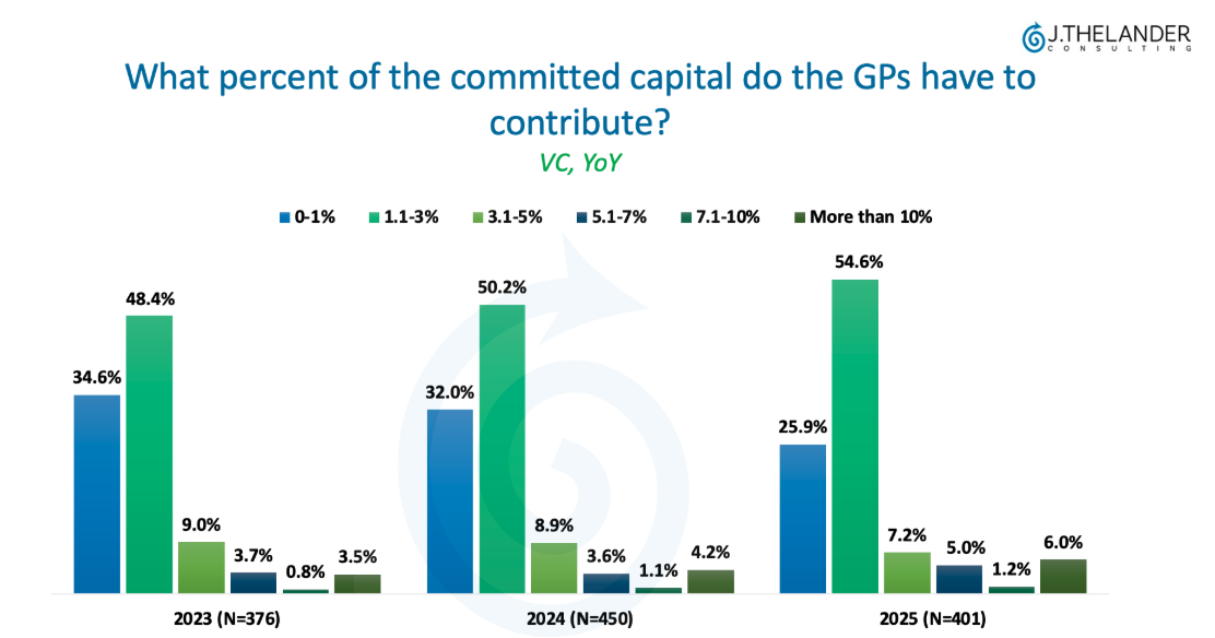 Since 2023, VC firms have been increasing how much capital GPs are expected to commit. Fewer funds now sit in the 0-1% category, falling from 34.6% in 2023 to 32.00% in 2024 and down to 25.9% in 2025.