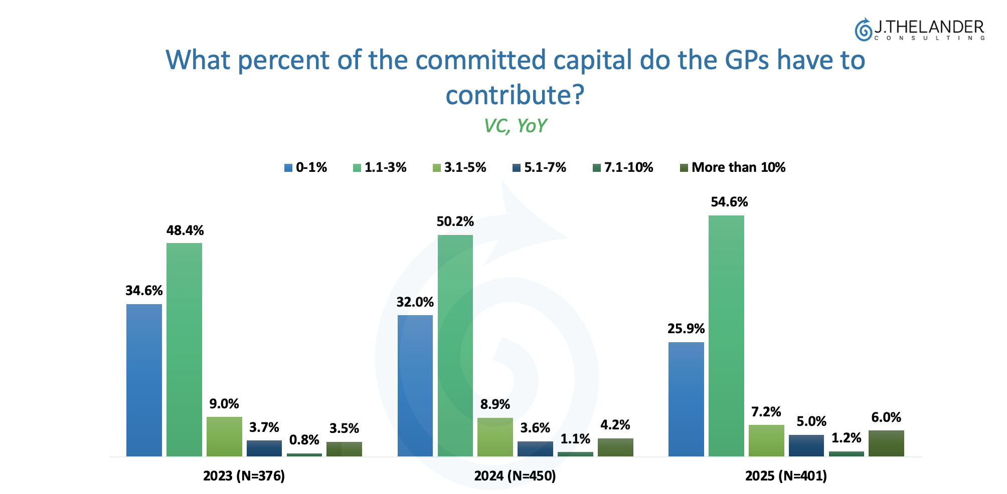 Meanwhile, the 1.1 – 3% category has been growing the most – steadily from 48.6% to 50.2% to 54.6% YoY. This indicates that LPs are increasingly asking fund managers to put up a higher stake in their funds overall.
